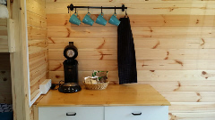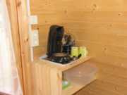 Doppelbett mit 140 x 200 cm Liegefläche und Leselampe | Kleine Kaffeeküche mit Senseo-Kaffeemaschine, Besteck und Geschirr | Möglichkeit zum Sitzen bei schlechtem Wetter |