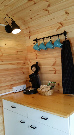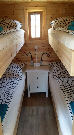 Sitzmöglichkeit bis zu 4 Personen | Kleine Kaffeeküche mit Senseo-Kaffeemaschine, Besteck und Geschirr | Rechts: Vier einzelne Etagenbetten mit einer Liegefläche á 90 x 200 cm. |